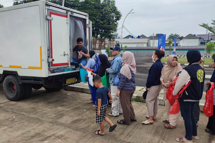 iDoPress/Febryan Kevin Antrian pengambilan daging, ikan, dan ayam yang merupakan program bantuan sembako bersubsidi di RPTRA Garuda, Kamis (19/6/2025).