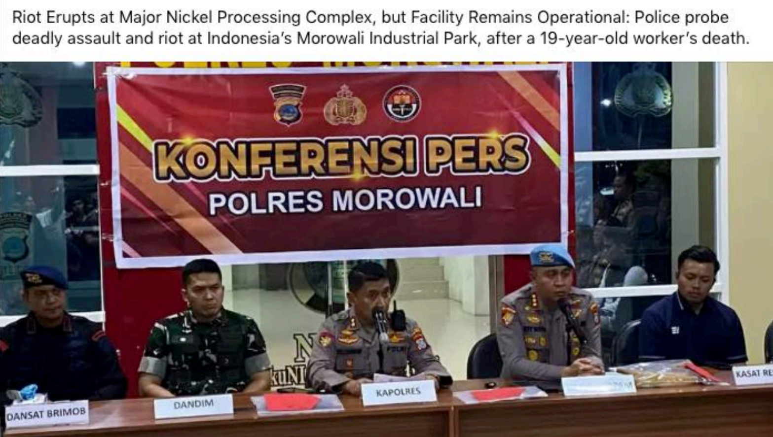 serangan fatal dan kerusuhan terjadi di IMIP, yang melibatkan vandalisme, penjarahan, dan pembakaran kendaraan. Kepolisian setempat menyatakan bahwa seorang pekerja berusia 19 tahun, yang dituduh melakukan pencurian pada hari sebelumnya,meninggal dunia akibat luka-luka yang diderita dalam dugaan serangan tersebut. Polisi telah memeriksa 18 saksi dan menahan empat tersangka, termasuk Kapolda Sulawesi Tengah dan tiga personel keamanan. Kepolisian saat ini sedang melakukan penyelidikan mendalam dan mencari bukti tambahan.